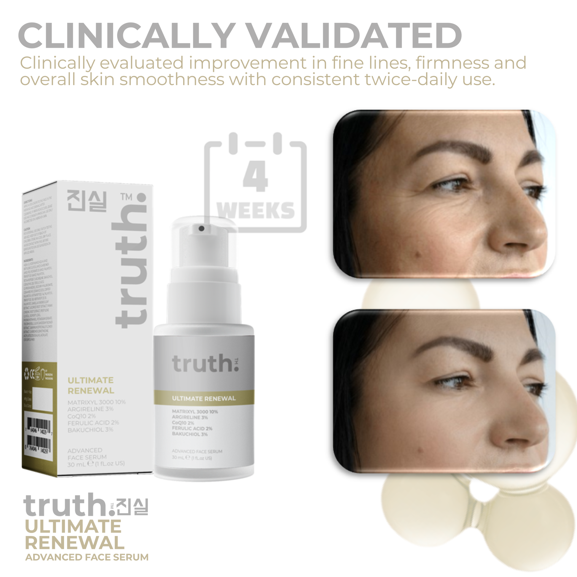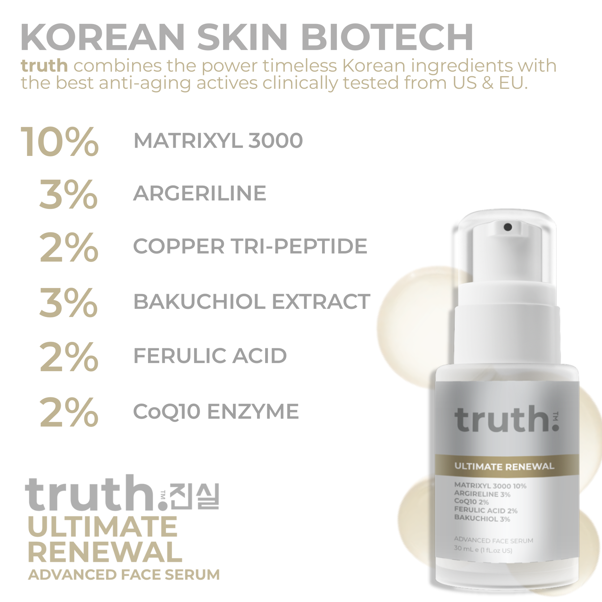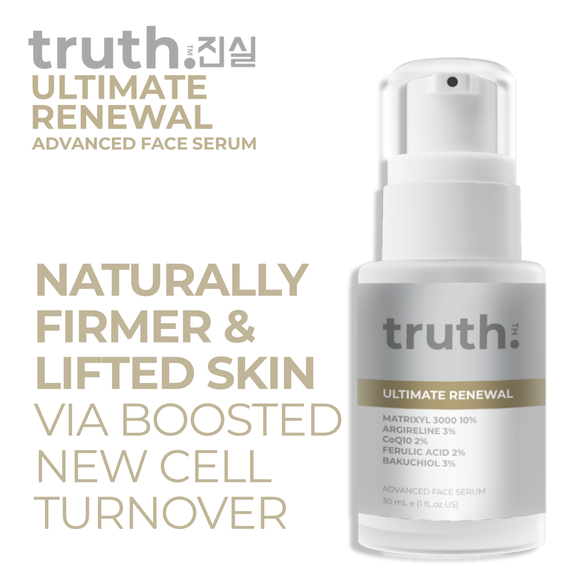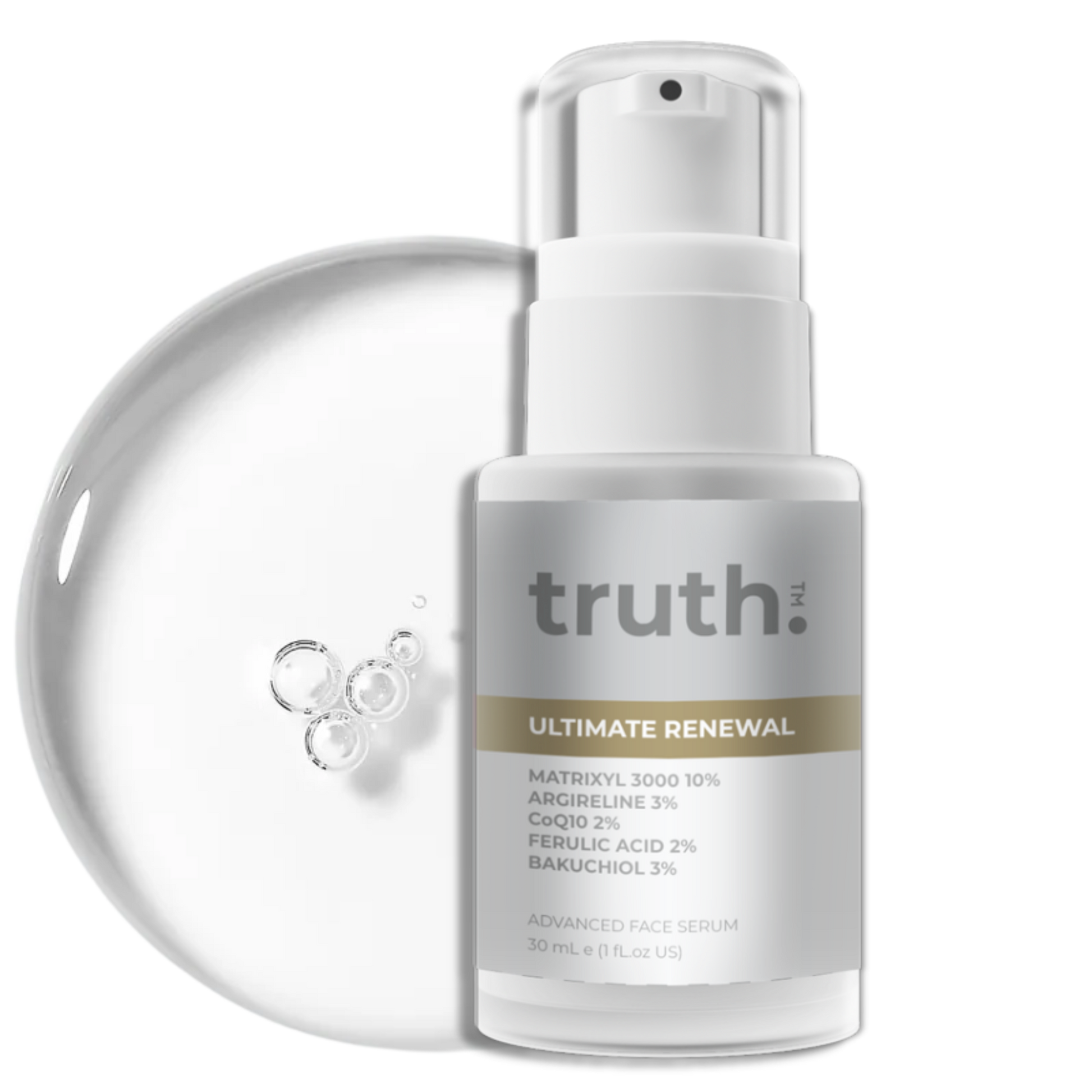 truth Ultimate Renewal Serum with MATRIXYL 3000™ 10%, CoQ10 2% and Argirilene® 3% promotes cell turnover to defy the signs of aging. Bakuchiol 3% naturally stimulates cell turnover, smoothens fine lines and wrinkles and helps restore firmness.