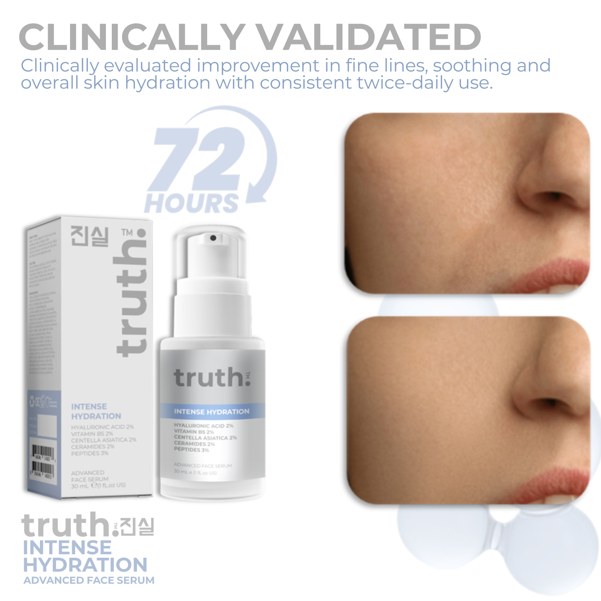 Our Instant Hydration Serum with Hyaluronic Acid 2% and the star next generation humectant Polyglutamic Acid 2% (holds 4 times more moisture than Hyaluronic Acid) provides 4x greater hydration that lasts for up to 72 hours.