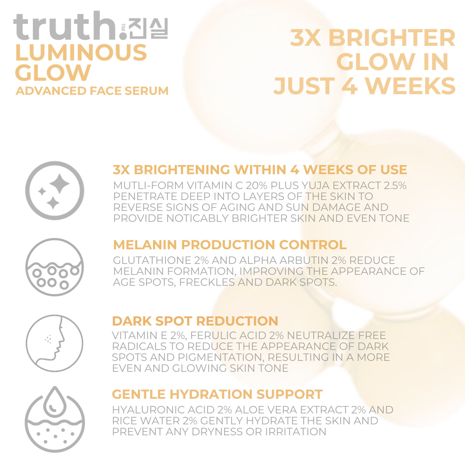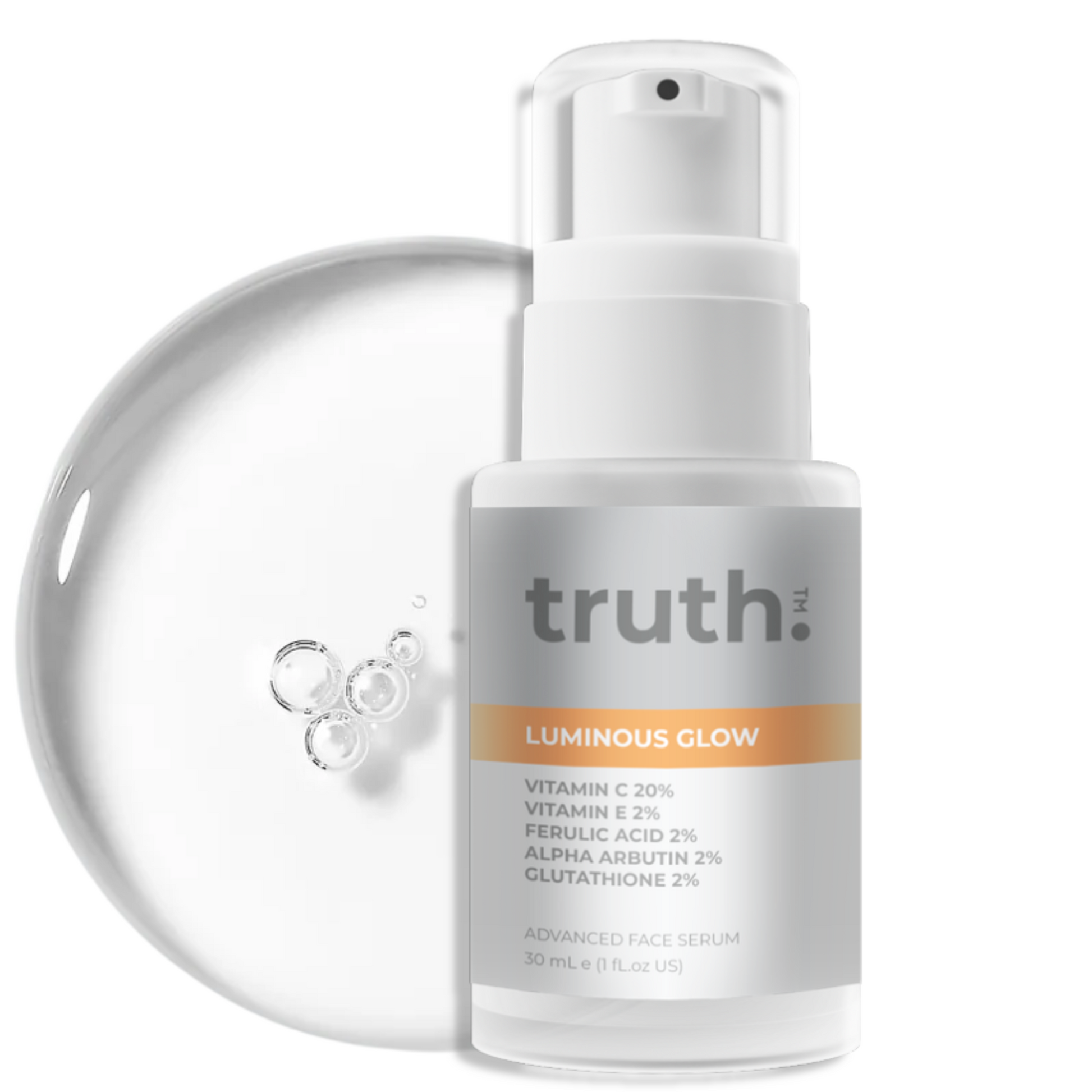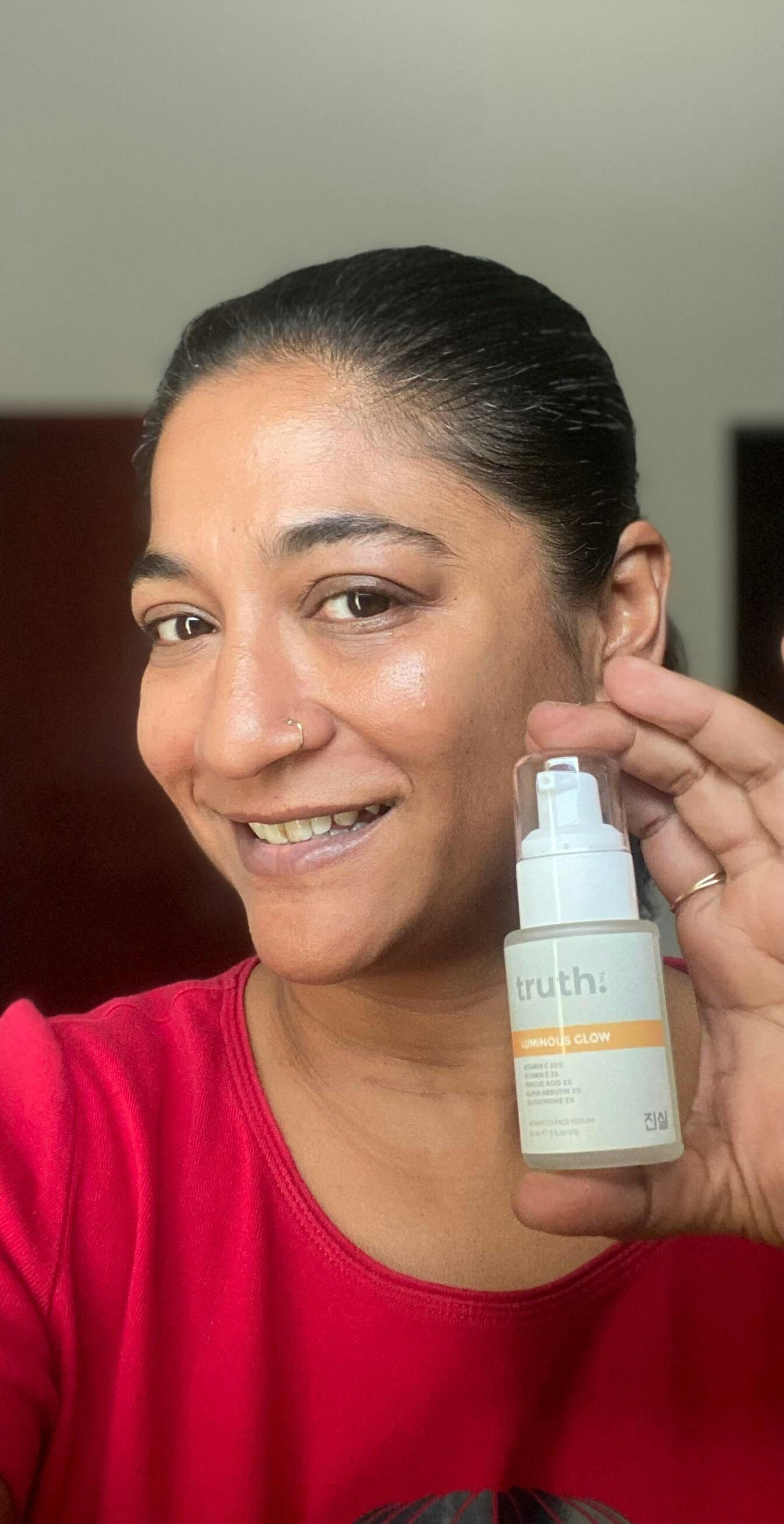 truth Luminous Glow Advanced Face Serum with Vitamin C 20% and Pure Yuja Extract 2.5% helps by visibly brightening the complexion and reducing signs of sun damage and photo aging.
