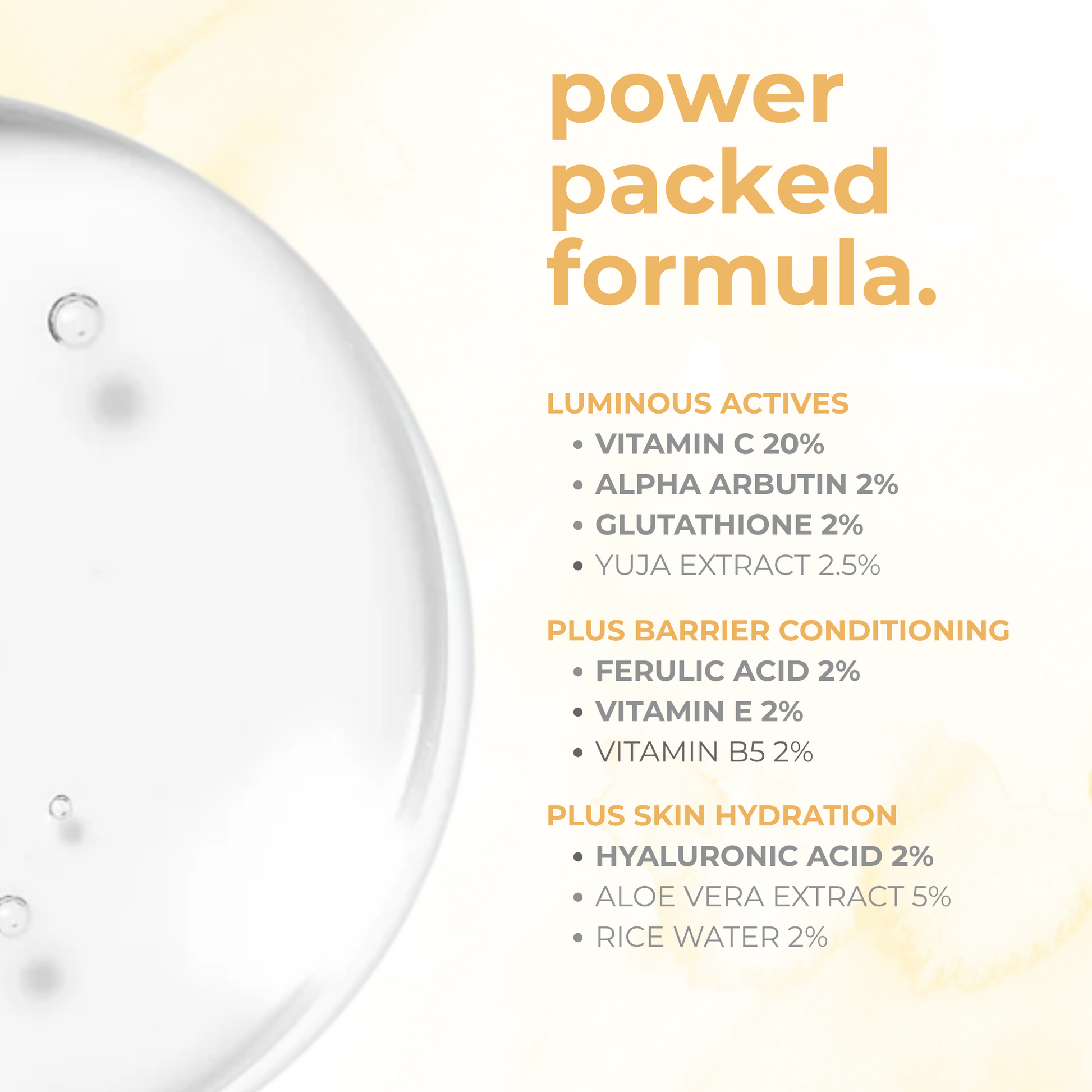 Vitamin C, Vitamin E, Ferulic Acid, Alpha Arbutin, Glutathione, Multi-molecular Hyaluronic Acid and Rice Water.